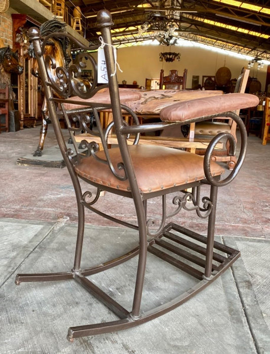 Mecedora artesanal de hierro forjado, tapizada en vinipiel y madera de parota, estilo español, ideal para terrazas y exteriores