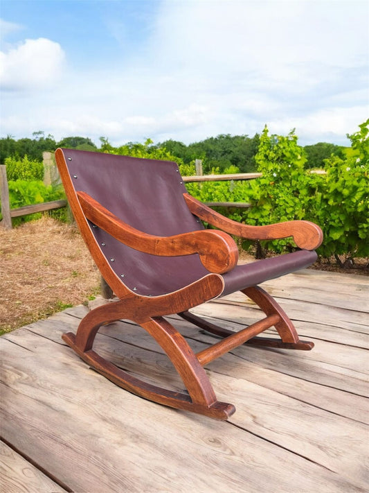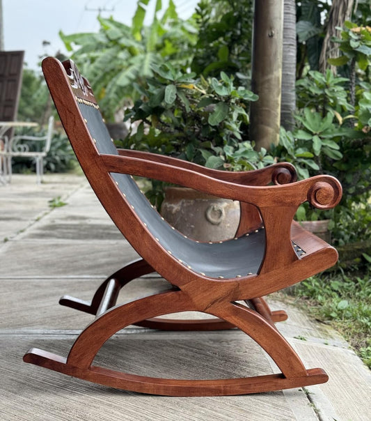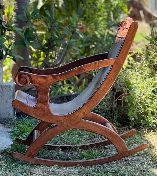 Silla Mecedora En Madera De Mezquite Y Piel Estilo Antiguo.