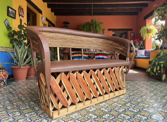 Sofa Love Seat Labrado Madera Mezquite Piel Estilo Hacienda.