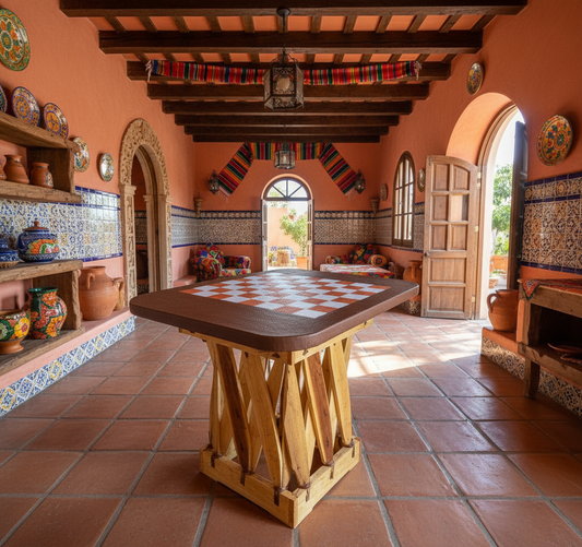 Bella Mesa Artesanal Con Tablero De Ajedrez Estilo Antiguo.