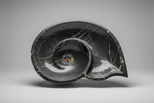 Lavabo de marmol negro en forma de fosil de caracol
