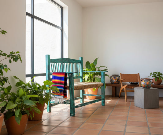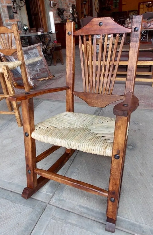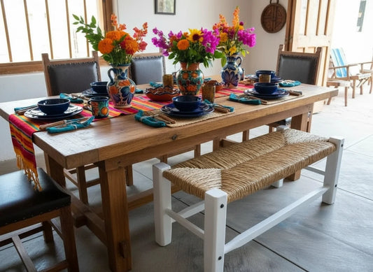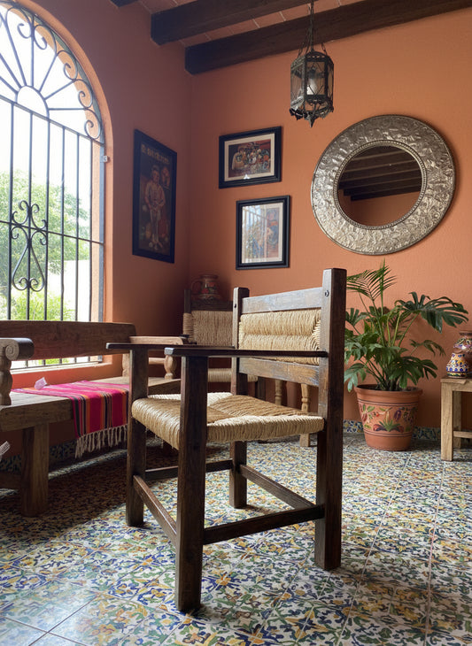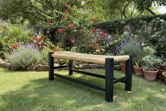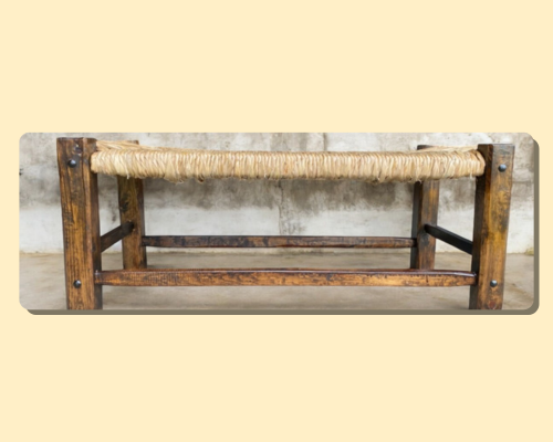 Banca artesanal de madera maciza con asiento tejido con tule, decoradas con hierro forjado, cera pulida a mano