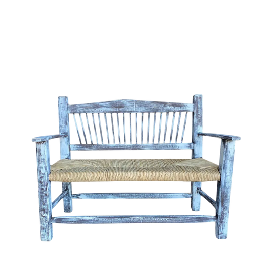Banca Artesanal Azul Madera Forja Y Tule Estilo Antiguo.