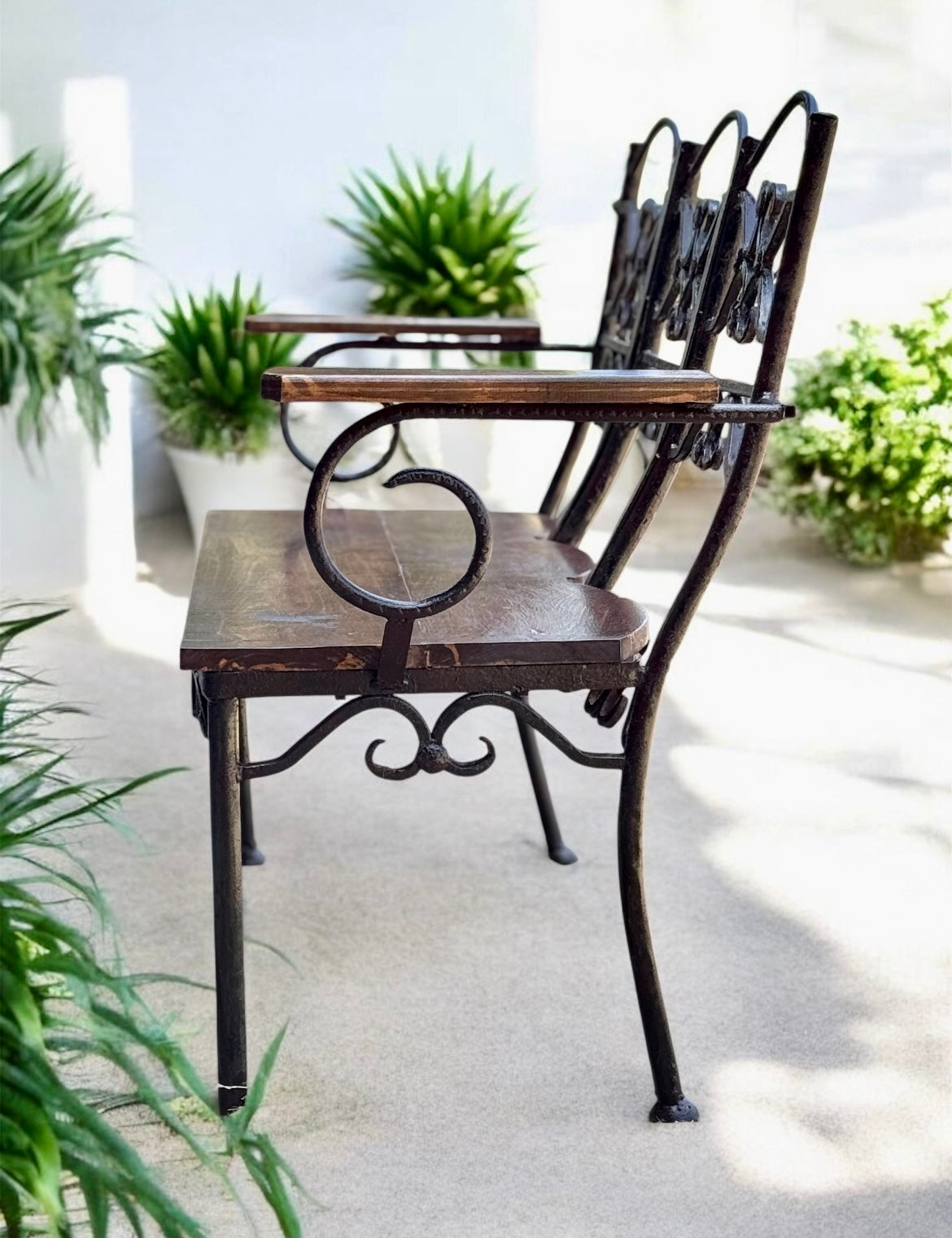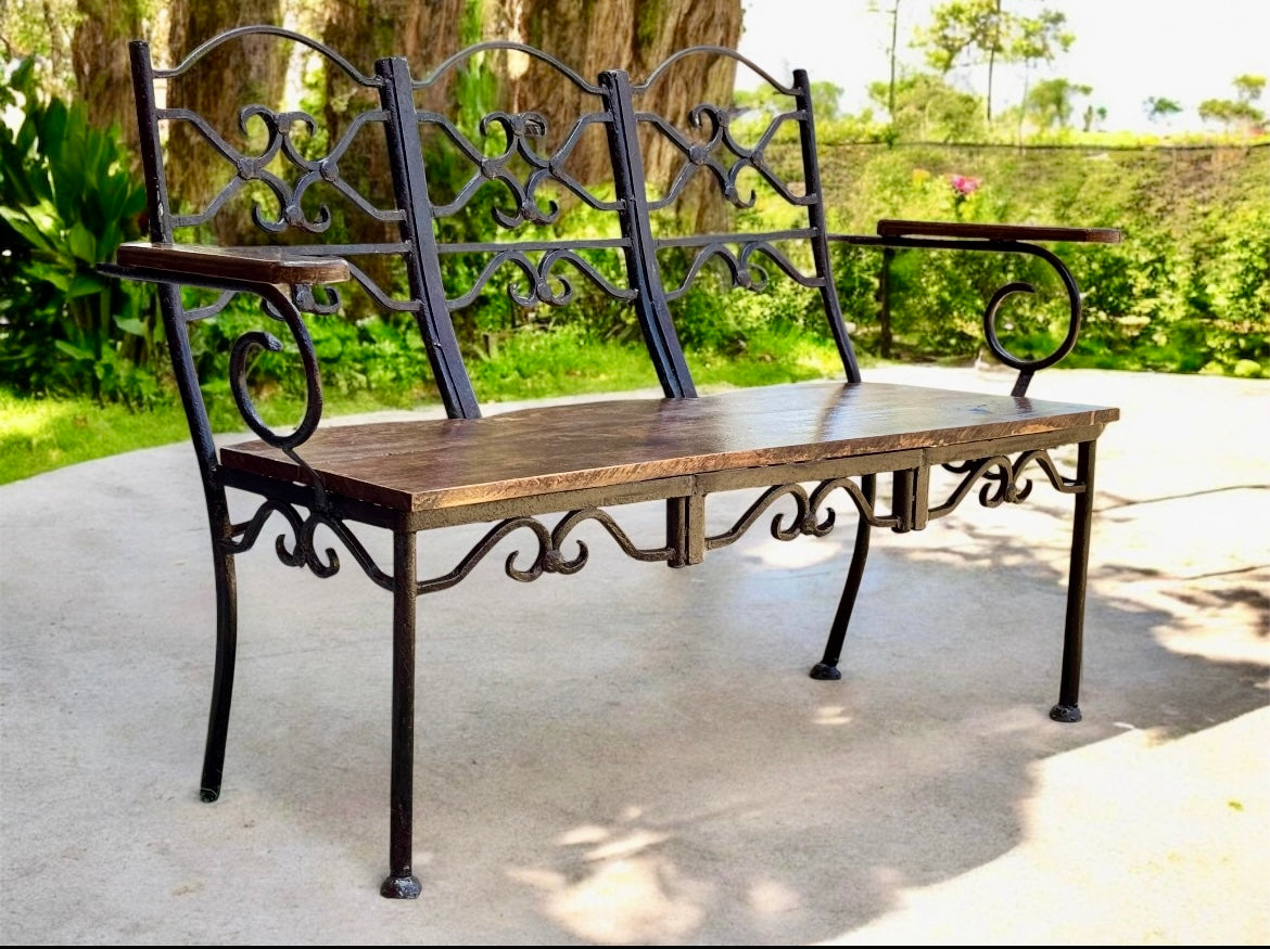 Preciosa banca artesanal fabricada en hierro forjado a mano en metal de grueso calibre, en estilo español. Su asiento y coderas son de madera de parota, esta terminada con esmalte anticorrosivo, y protegida con barniz marino tanto en el hierro como en la madera. Es una mecedora muy cómoda y con estilo único. NO dejes que te la ganen, GRAN CALIDAD Y DISEÑO eso nos distingue. Nota: El costo de envío que es solo en donde tengas cobertura la paquetería estrella blanca, pero podemos enviar a cualquier parte del país mediante otras compañías.