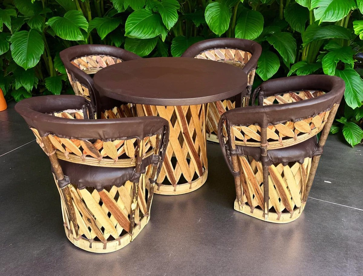 Transform your space with the Equipal Leather Dining Room from Galería Tonaltecas Jaliscienses, a piece that combines tradition and elegance. This classic dining room includes a 100 cm diameter round table, ideal for sharing unforgettable moments with family and friends. The four chairs, crafted from wood and leather, offer exceptional comfort, with a height of 80 cm and a design that adapts to any setting.