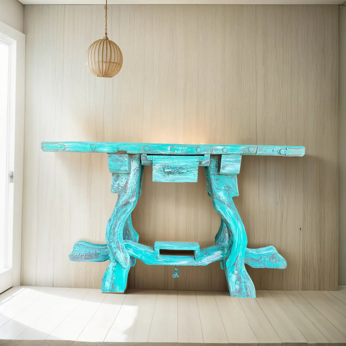 This piece is waxed and polished by hand, and protected with marine varnish.