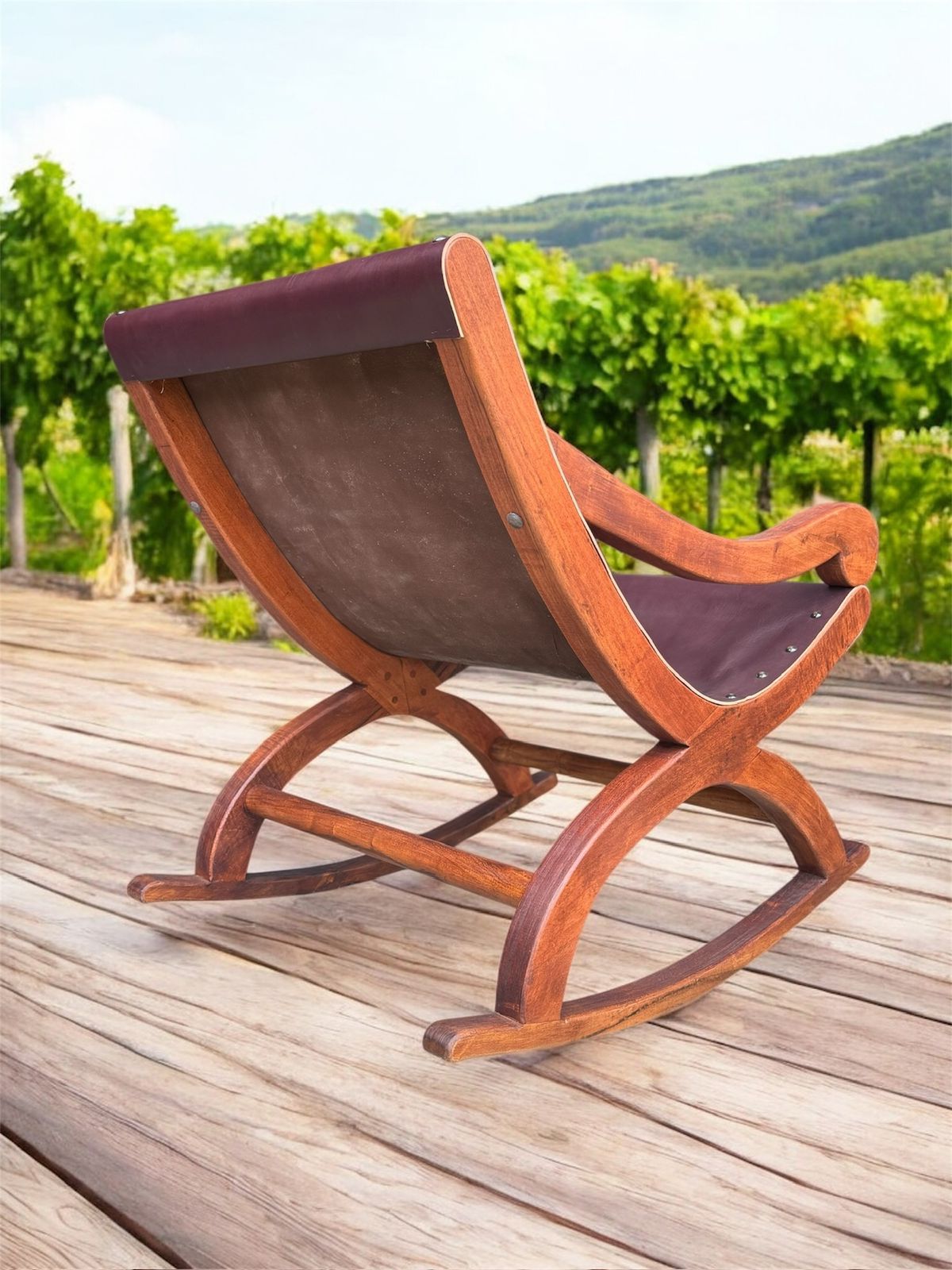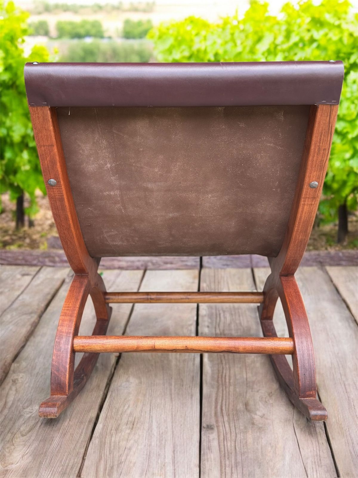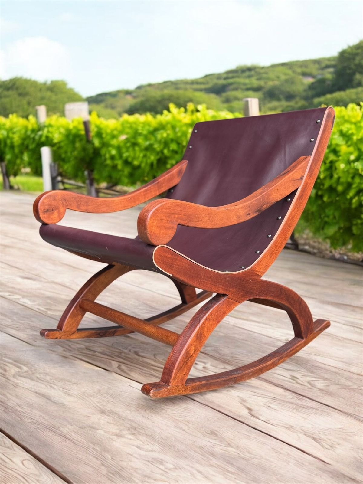 Precioso sillon mecedora de descanso estilo Miguelito artesanal de madera maciza de mezquite, tapizado con piel lisa, además esta decorado con hierro forjado y protegido con cera pulida a mano y barniz marino.