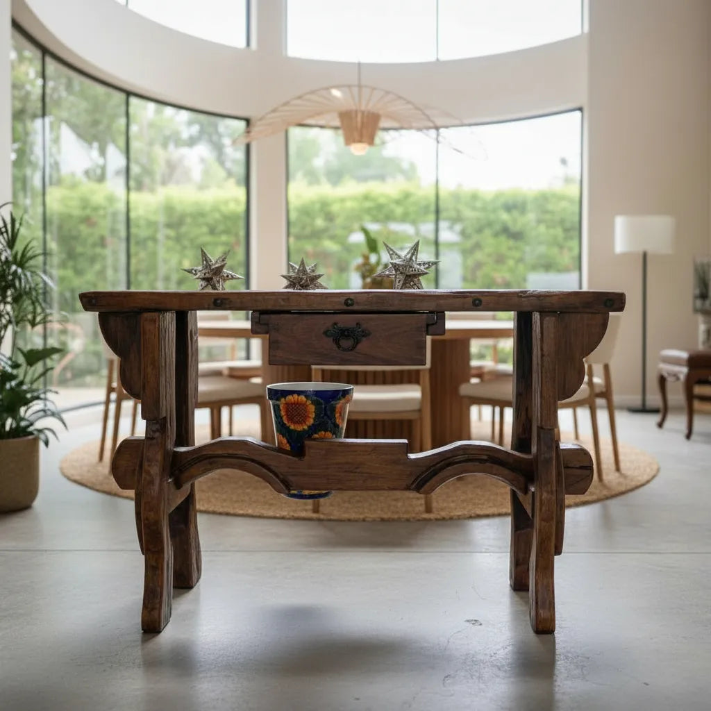 La Antigua Credenza Coqueta Patas De Yugos antiguos y una cubierta de puerta vieja, es una pieza única que combina elegancia y funcionalidad. Fabricada por Galería Tonaltecas Jaliscienses, su acabado rústico resalta la belleza de la madera antigua, aportando un toque clásico a cualquier espacio. Con un diseño que evoca la tradición, esta credenza es ideal para quienes buscan un mueble que cuente una historia.