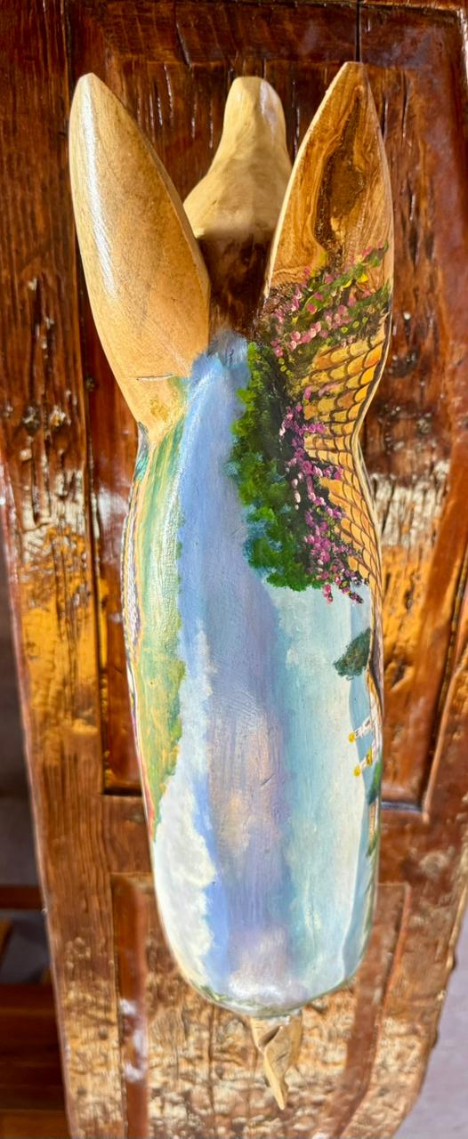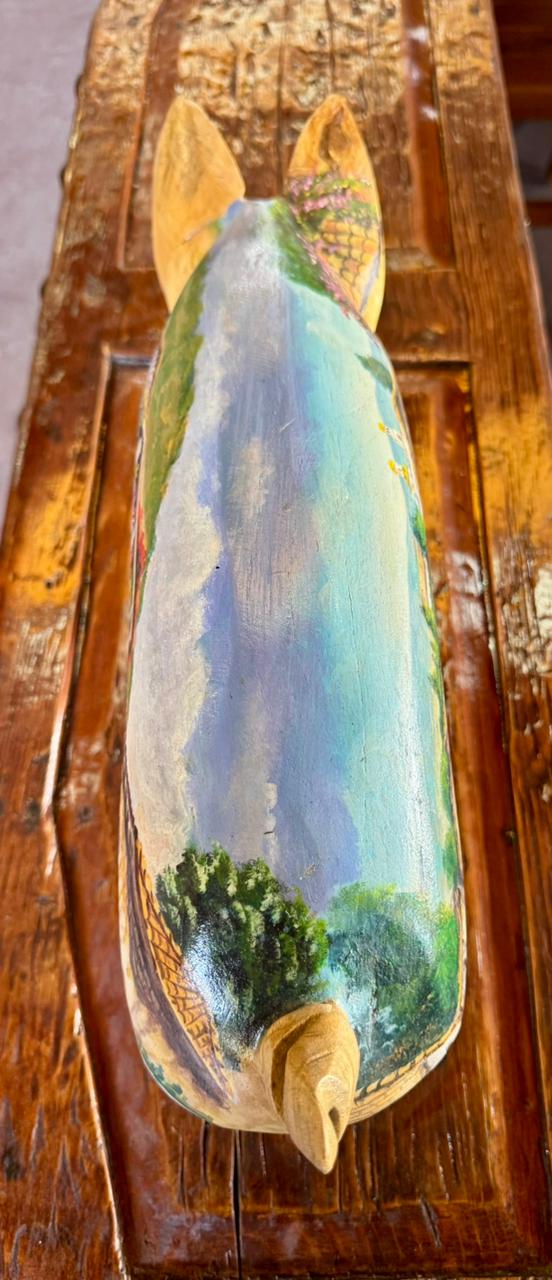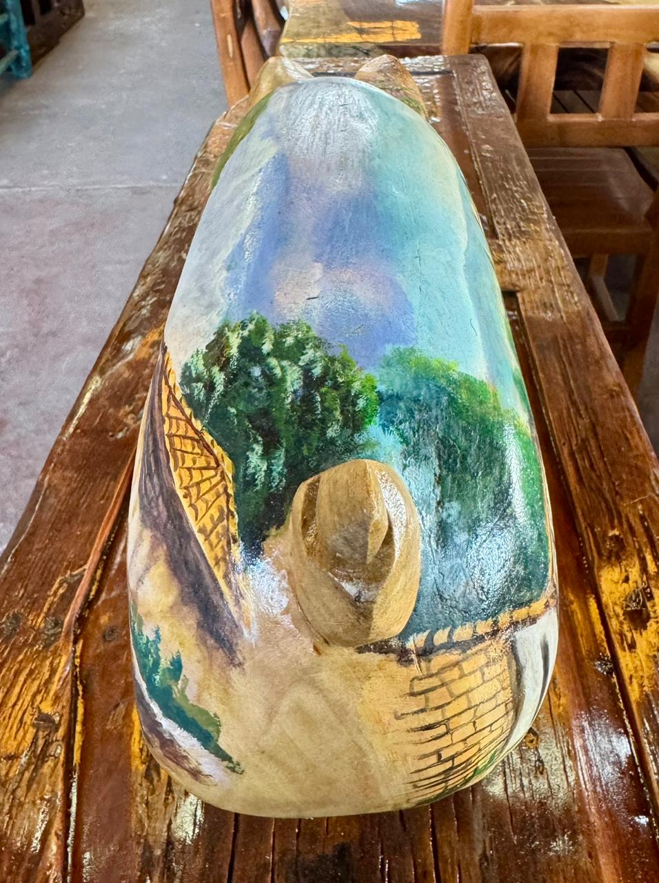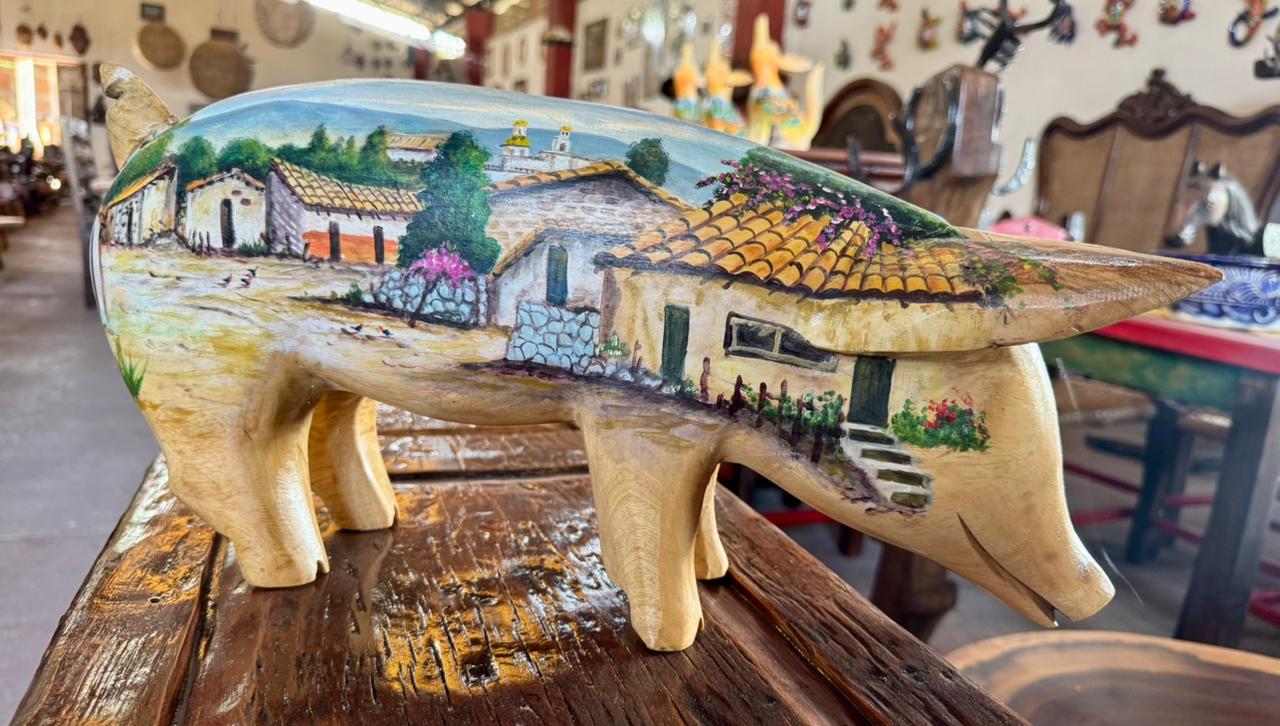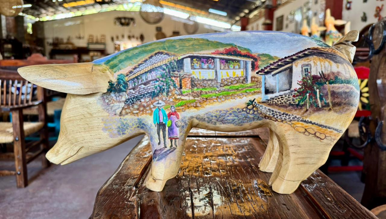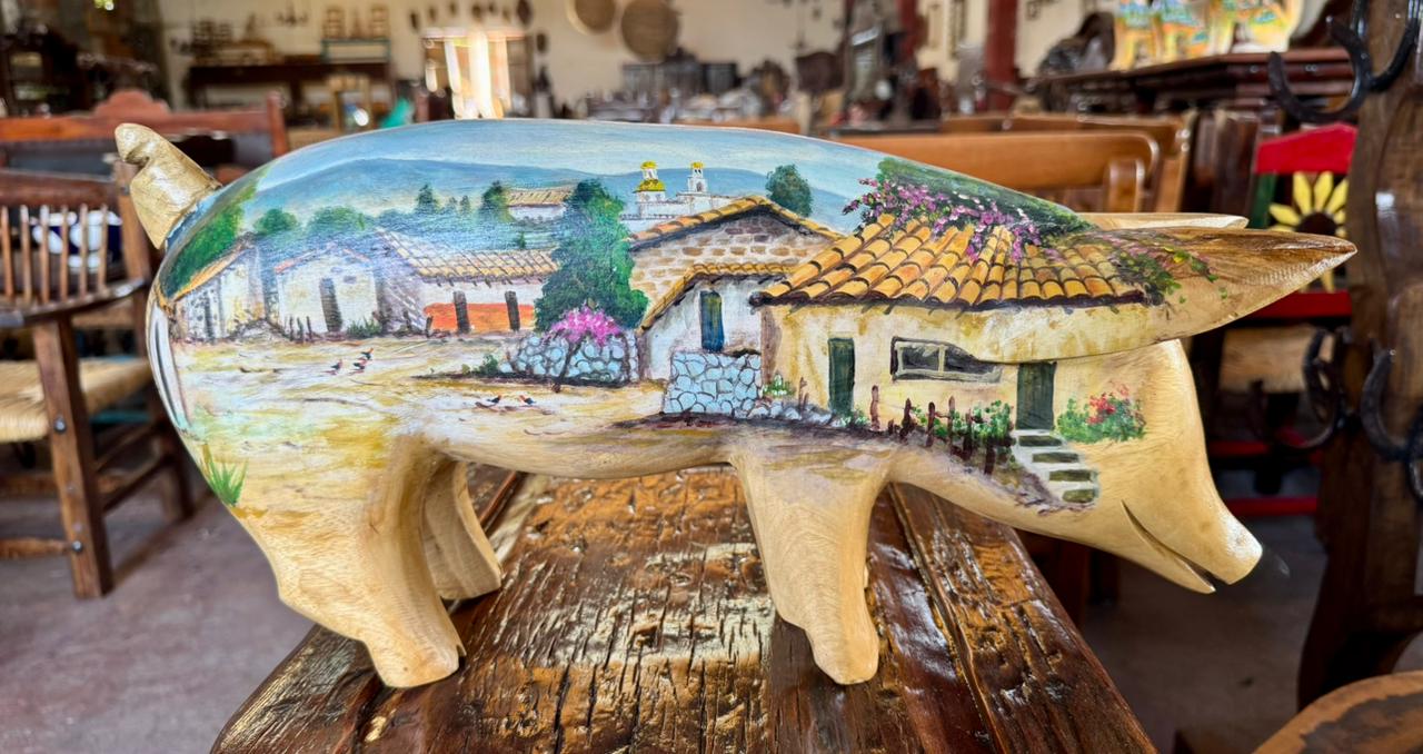 Esta escultura de cerdo, elaborada en madera de fresno y pintada al óleo, es una pieza que agrega un toque distintivo a cualquier espacio.