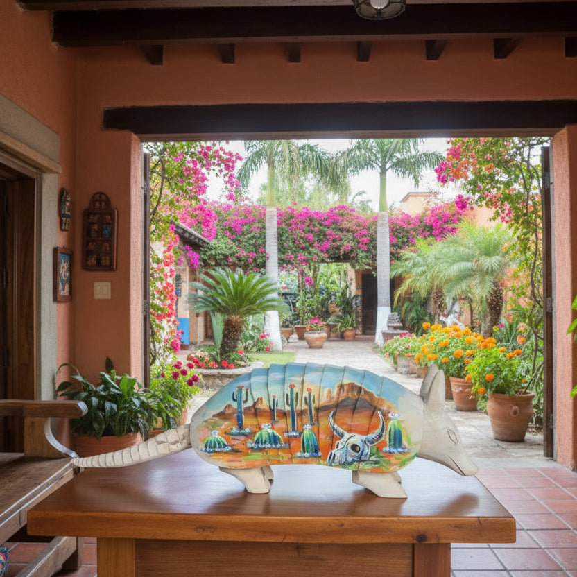 Esta escultura de armadillo, elaborada en madera de fresno y pintada al óleo, es una pieza que agrega un toque distintivo a cualquier espacio.