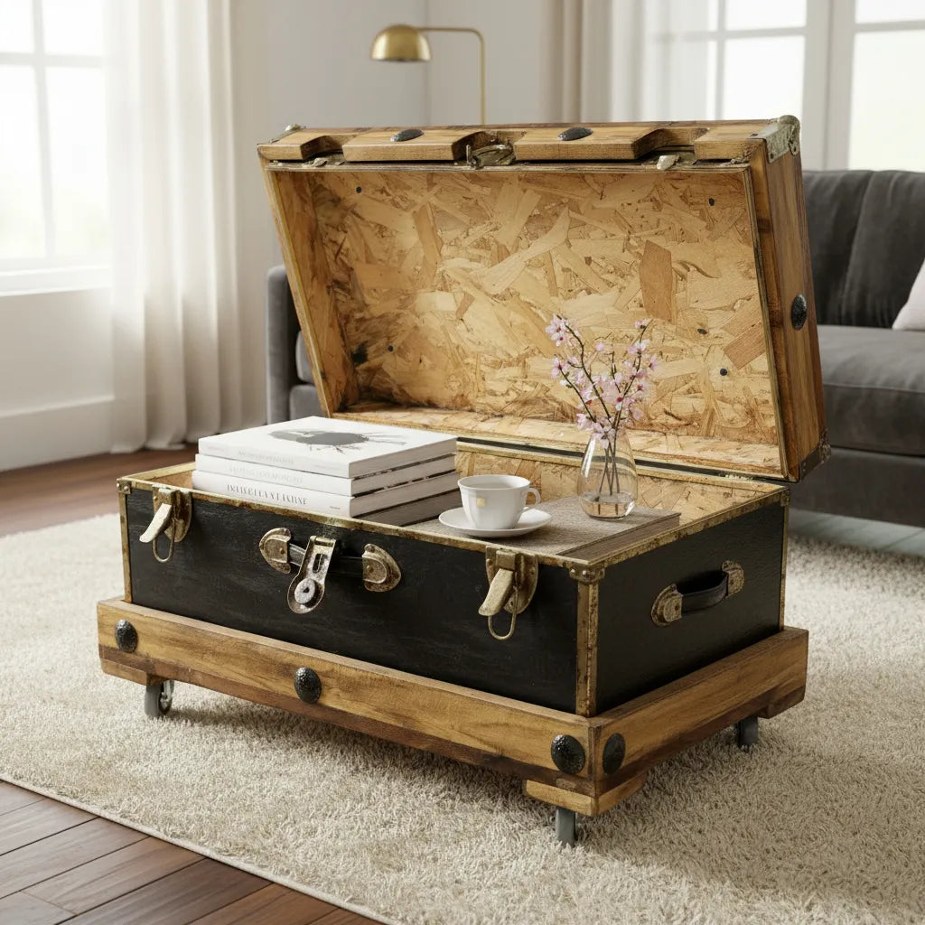 Este mueble no solo sirve como mesa de centro, sino que también ofrece un amplio espacio de almacenamiento, ideal para mantener el orden en tu hogar, su petaca antigua resalta la belleza de la mesa y sus ruedas la hacen muy servicial, convirtiéndola en un elemento decorativo que atrae miradas.