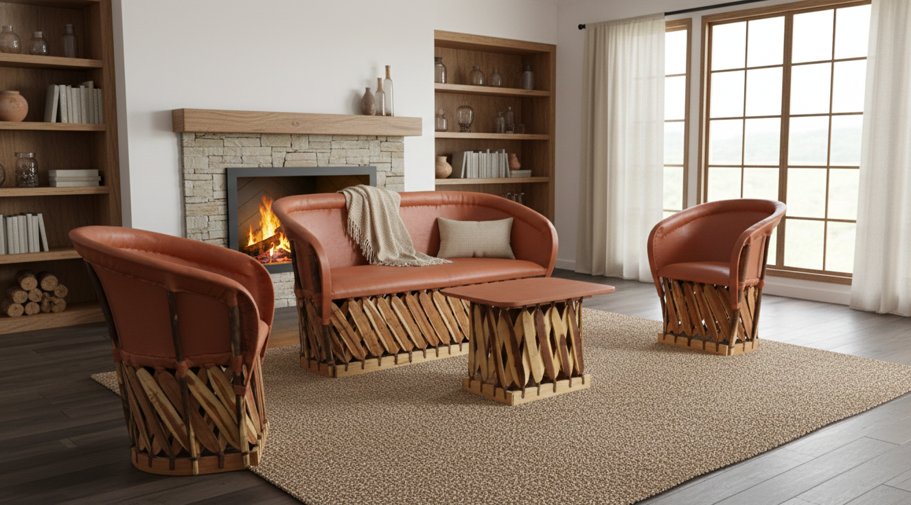Sala Artesanal De Equipal En Madera Y Piel Estilo Antiguo..