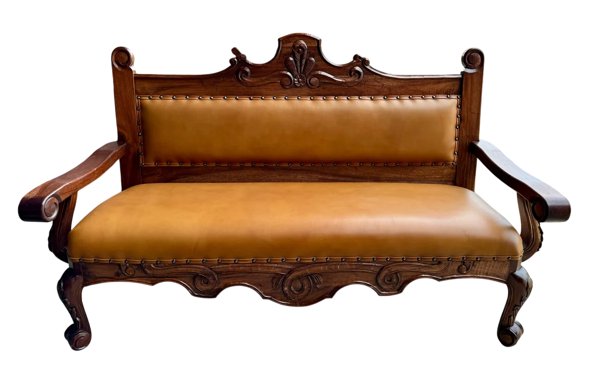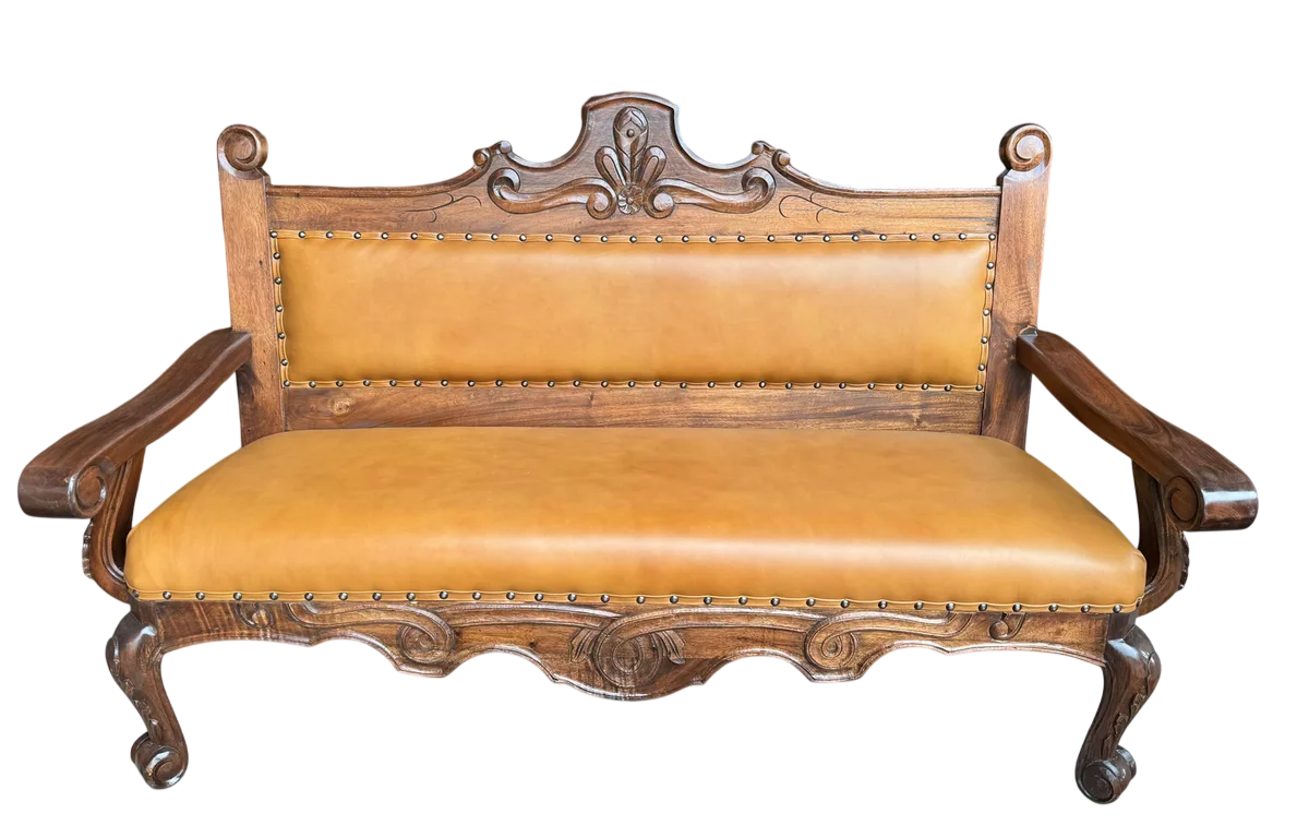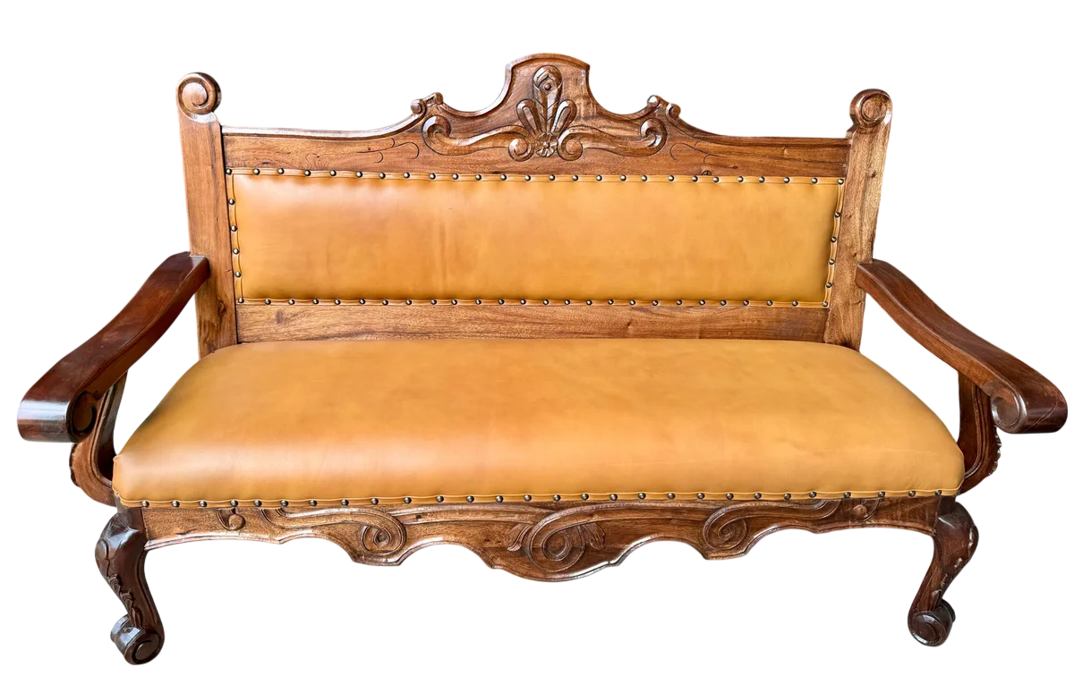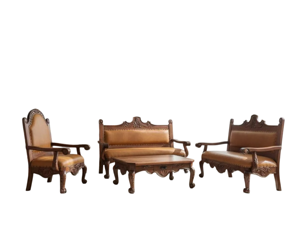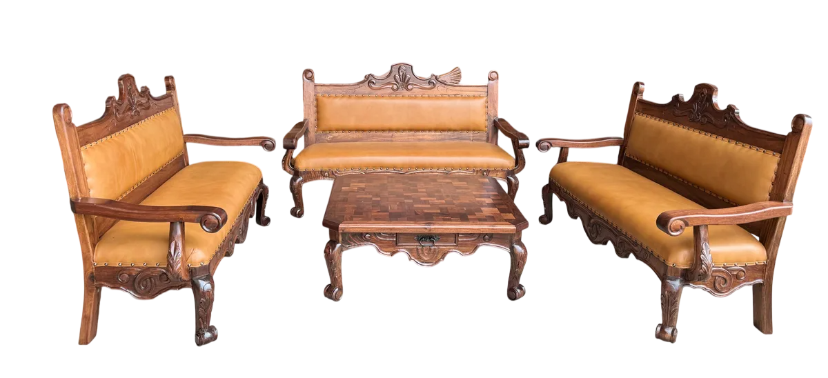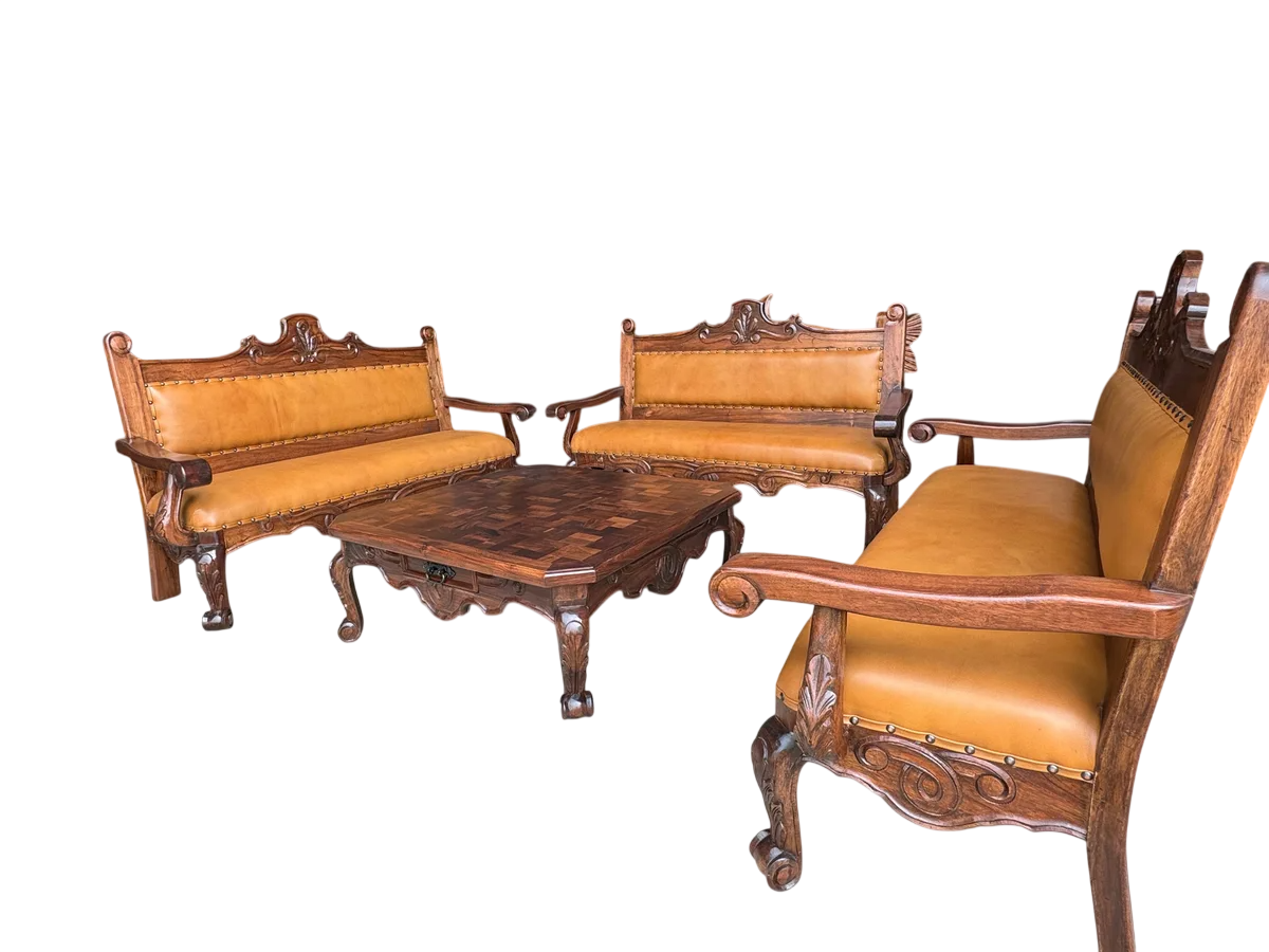 Se fabrica a tu gusto y se entrega en un plazo máximo de 2 meses. Increíble sala elaborada en madera de mezquite, bellamente labrada a mano por especialistas, los mejores de Mexico, este set cuenta con un cómodo tapizado en piel genuina, podemos elaborarla a tu gusto, por ejemplo, un tono de madera más oscura o más clara, un tono de piel diferente, etc… Esta sala es el complemento perfecto para aquellos que buscan un toque de sofisticación y carácter en su hogar, este conjunto destaca no solo por su estética, sino también por la calidad de sus materiales, que aseguran una durabilidad excepcional y un estilo atemporal.