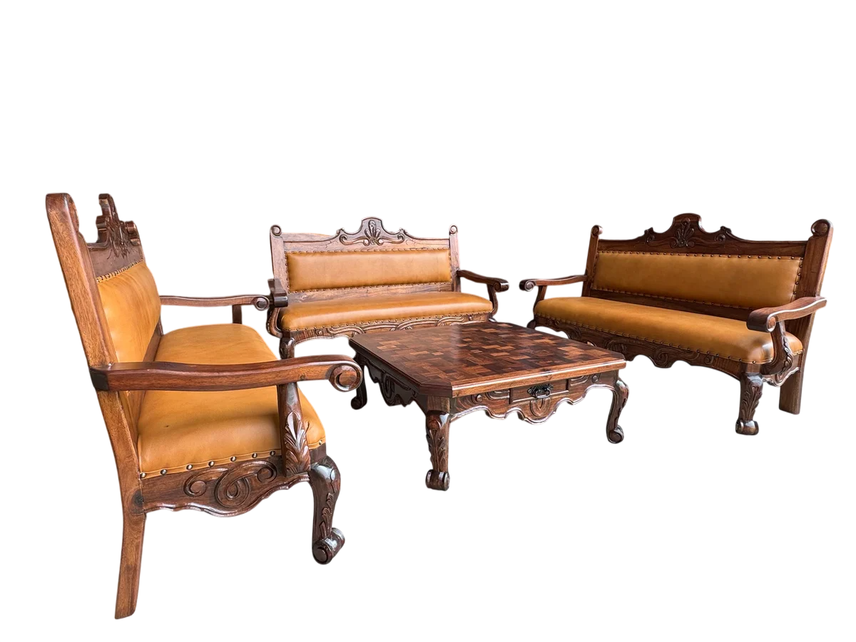 Los sillones, elaborados en robusta madera de mezquite y tapizados en piel genuina, ofrecen una comodidad inigualable para disfrutar de largos momentos en familia o con amigos. Con un total de seis cuerpos distribuidos en tres sillones, este conjunto se adapta perfectamente a distintas configuraciones de espacios. La sala incluye tres sillones dobles y una amplia mesa de centro, con cajones y cubierta trabajada en marquetería. Complementa la armonía del diseño, creando un ambiente acogedor y elegante. Su cuidado diseño y acabados finos hacen de esta sala una pieza central que atraerá todas las miradas. Galería Tonaltecas Jaliscienses… Diseños exclusivos para clientes exclusivos. Garantía de fábrica: 12 meses